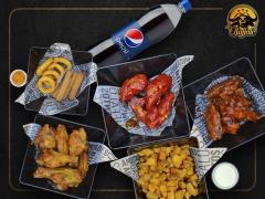 6 Alitas en 2 salsas de tu elección, 280 g de costillas, 4 deditos de queso, papas en casco, dip de queso y 1 gaseosa de 400 ml gratis.