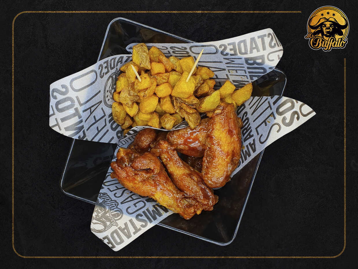 Alitas 6 piezas, una porción de papas, 2 salsas de tu elección.