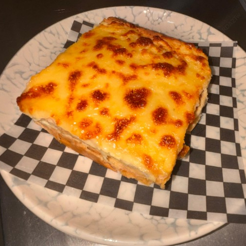 Pan artesanal cubierto de pollo desmechado, salsa bechamel cremosa y queso gratinado.