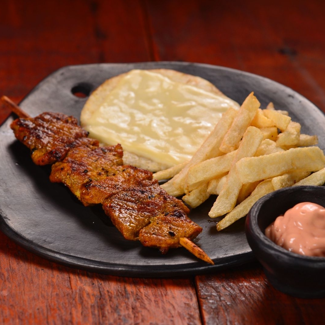 chuzo de cerdo con guarnición de papa a la francesa, arepa con queso y salsa rosada