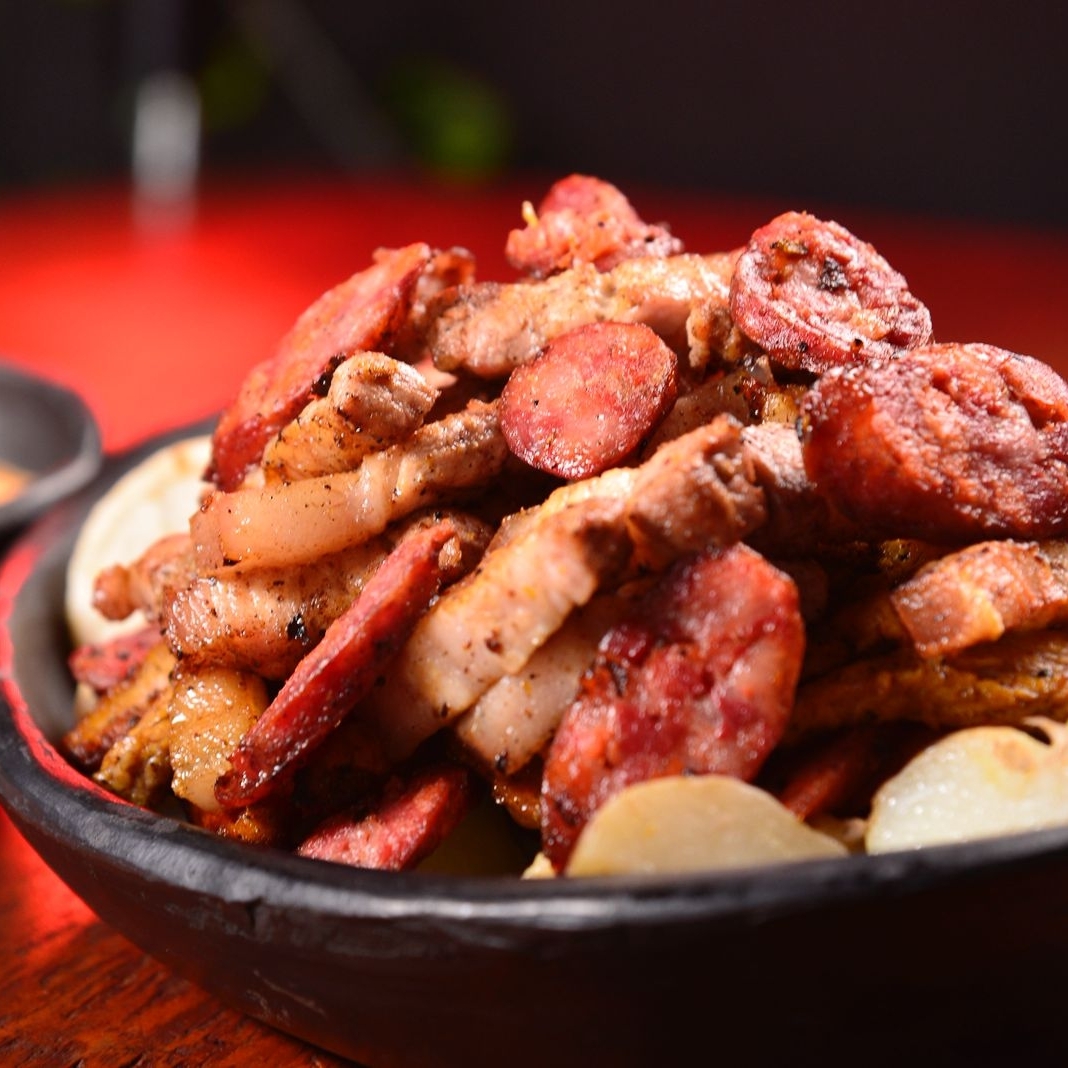 Base de papa al vapor y arepas, chorizo, bondiola de cerdo, chicharrón y salsa BBQ (3-4 personas aproximadamente)