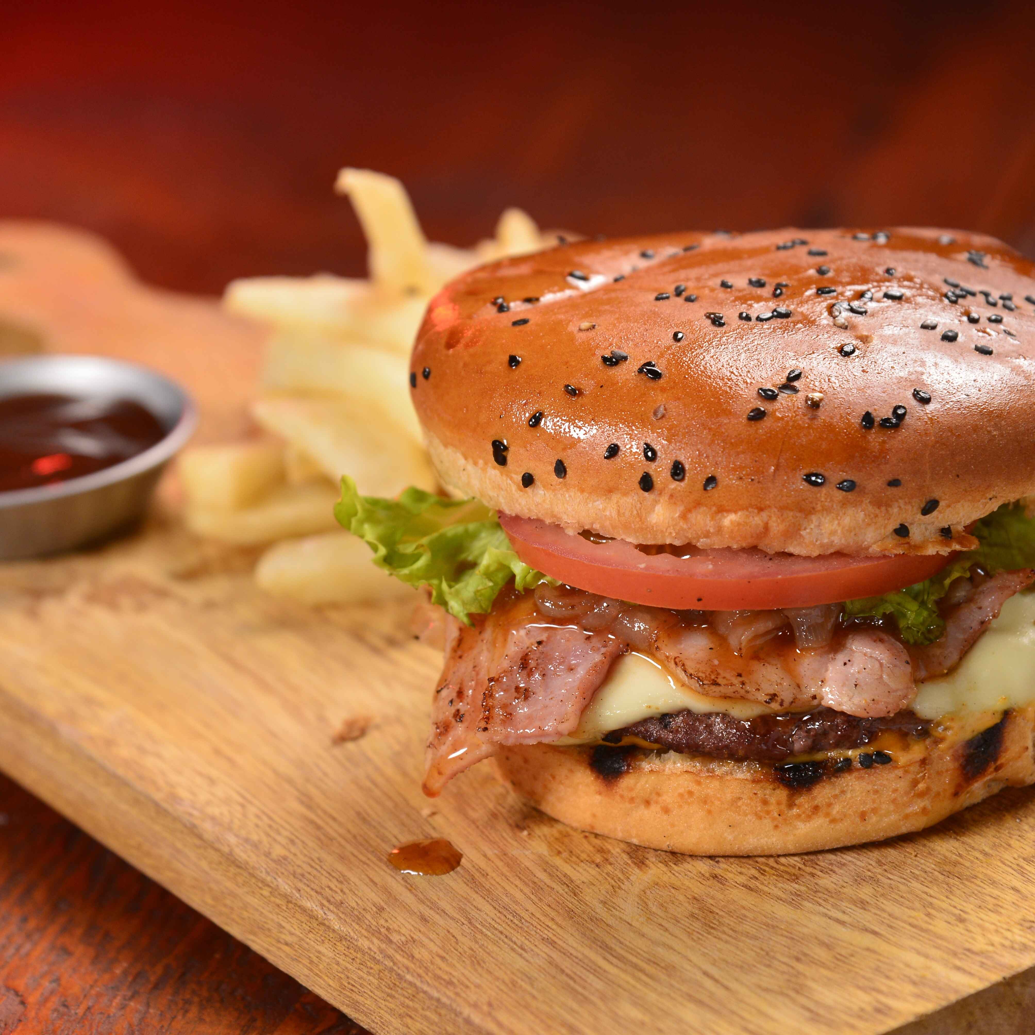 Pan brioche con salsa de la casa acompañado de un filete de pollo, mozzarella, tocineta, cebolla caramelizada, tomate y lechuga con guarnición de papas a la francesa y salsa rosada