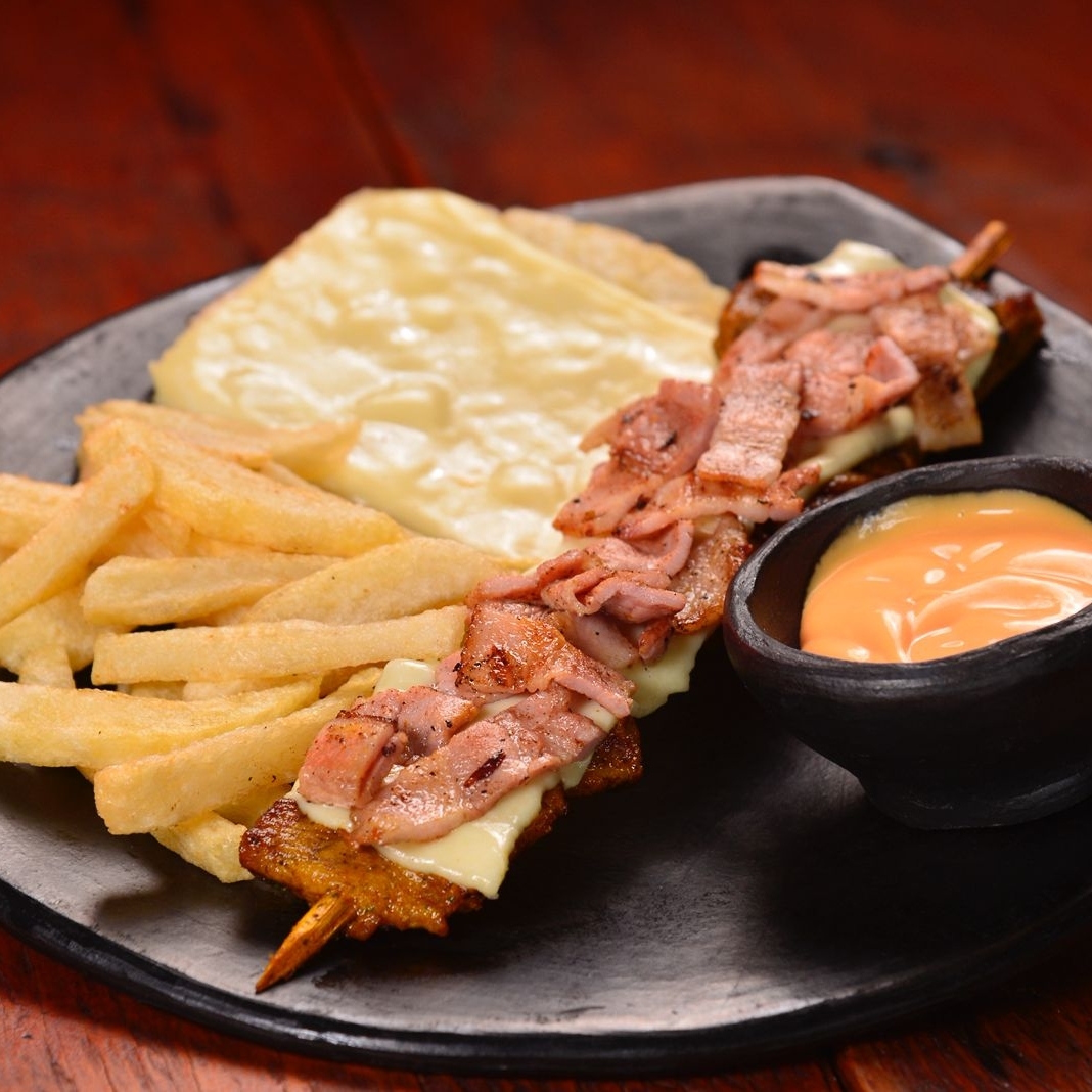 chuzo de la casa con queso y tocineta, con guarnicion de papa a la franceza, arepa con queso y salsa rosada