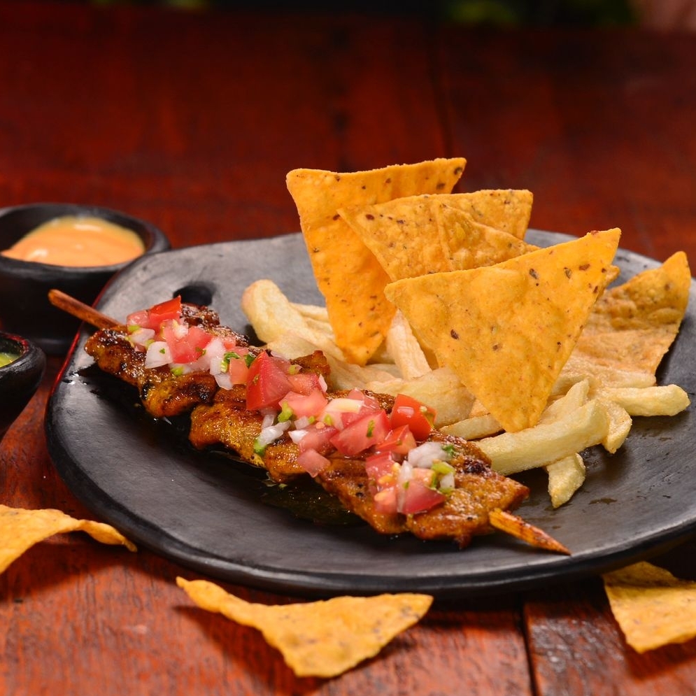 chuzo de la casa con pico de gallo, con guarnición de papa a la francesa, nachos y guacamole