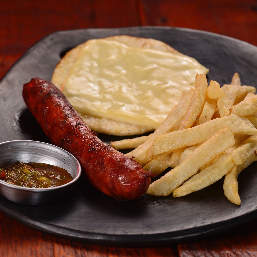 Chorizo de cerdo con guarnición de papa a la francesa, arepa con mozzarella y chimichurri