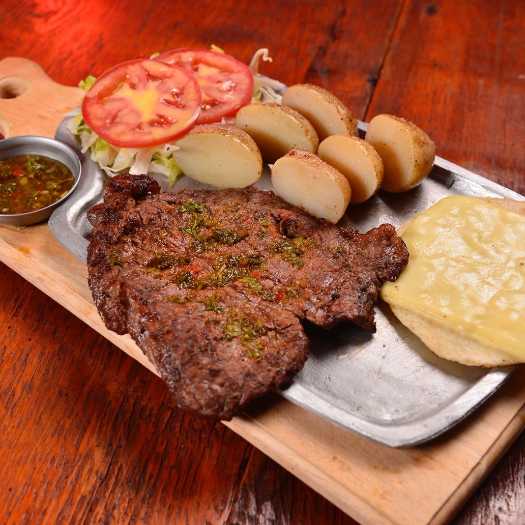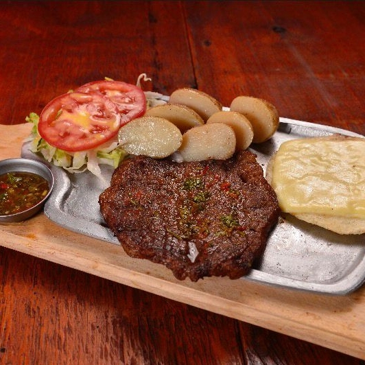 200 gr de churrasco con guarnicion de papa al vapor, arepa con mozzarella, ensalada y chimichurri.