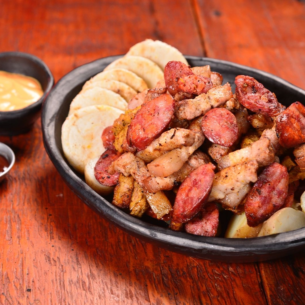 Base de papa al vapor con arepas, bondiola de cerdo, chorizo, chicharrón y salsa BBQ (1-2 personas aproximadamente)