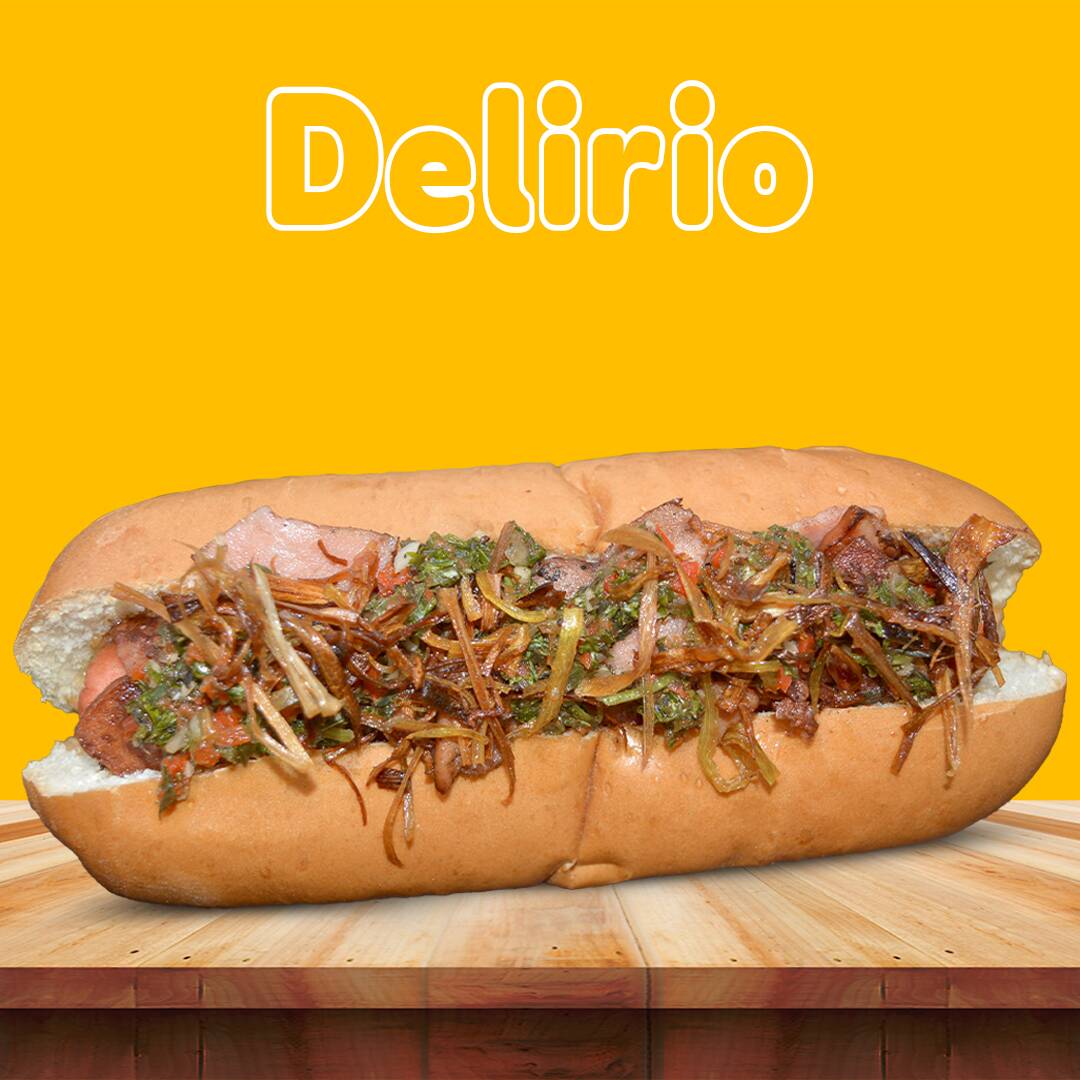 Pan artesanal brioche, salchicha extragrande americana, tocineta en trozos, chimichurri argentino, puerro caramelizado.