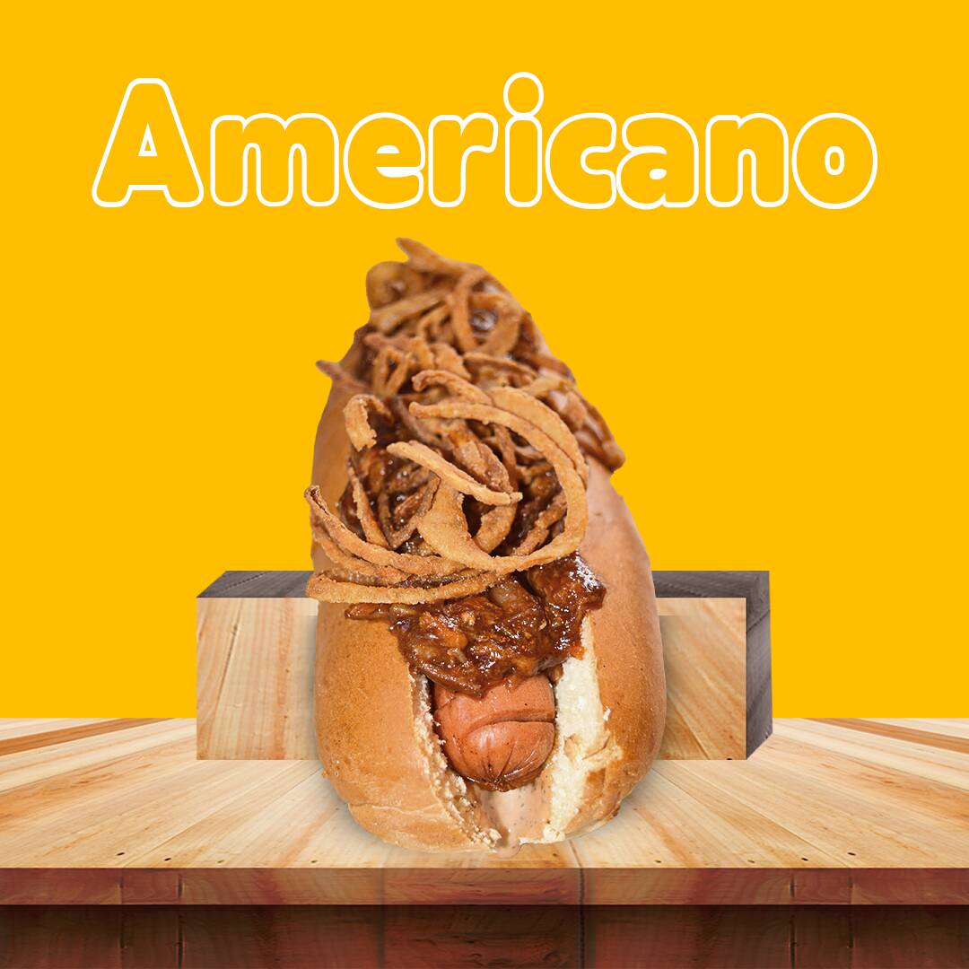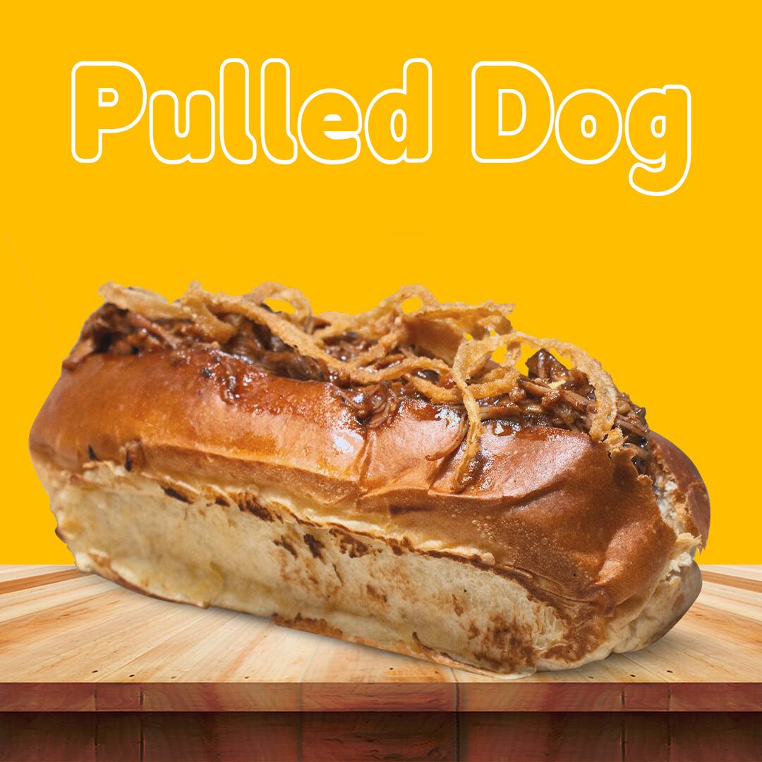 Pan artesanal brioche, salchicha extra grande americana, queso mozzarella, carne desmechada pulled pork., cebolla crocante