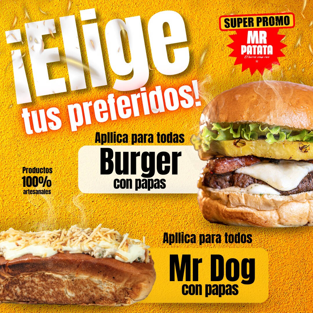 1 Burger con papas a eleccion de la carta + 1 perro con papas a eleccion de la carta