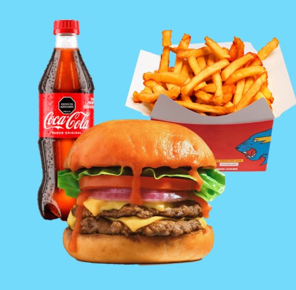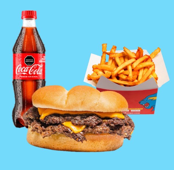 Hamburguesa de carne de res (80g) con bordes crujientes y sazón de la casa ketchup, mayonesa y queso americano sobre pan brioche tostado + papas + bebida a elección.