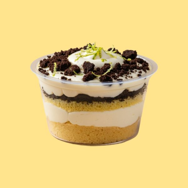 Base de torta de vainilla con capas de mousse de limón y Oreo triturada.