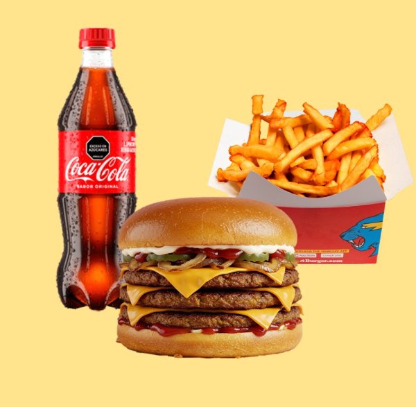 Hamburguesa con tres carnes de bordes crujientes y sazón de la casa, queso americano, cebolla asada, pepinillos, mayonesa, ketchup y mostaza brown sobre pan brioche tostado + papas + bebida a elección.