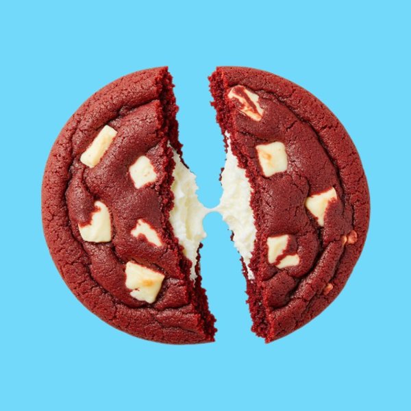 Galleta de Red Velvet con chunks de chocolate blanco y relleno de Cheesecake.