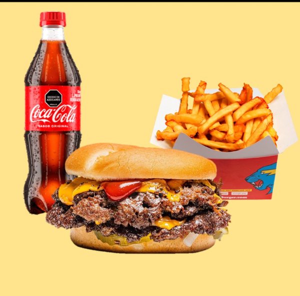 Hamburguesa con dos carnes de bordes crujientes y sazón de la casa, queso americano, mayonesa, vegetales (tomate, lechuga y cebolla), ketchup y mostaza brown sobre pan brioche tostado + papas + bebida a elección.