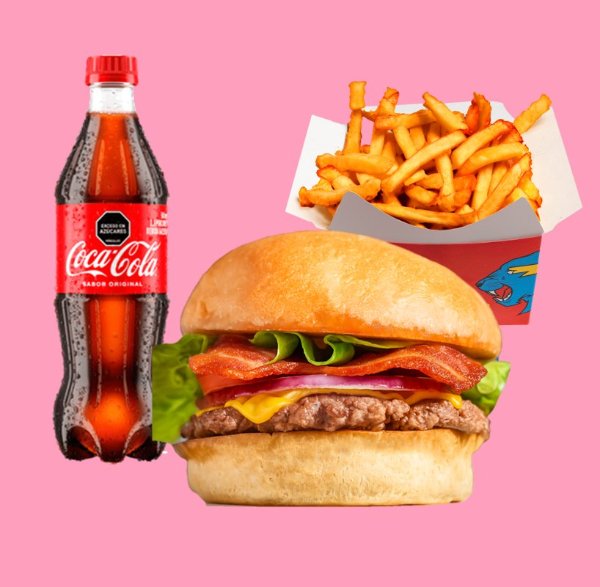 Hamburguesa carne de bordes crujientes y sazón de la casa, queso americano, bacon y vegetales (tomate, lechuga y cebolla), sobre pan brioche tostado + papas + bebida a elección.