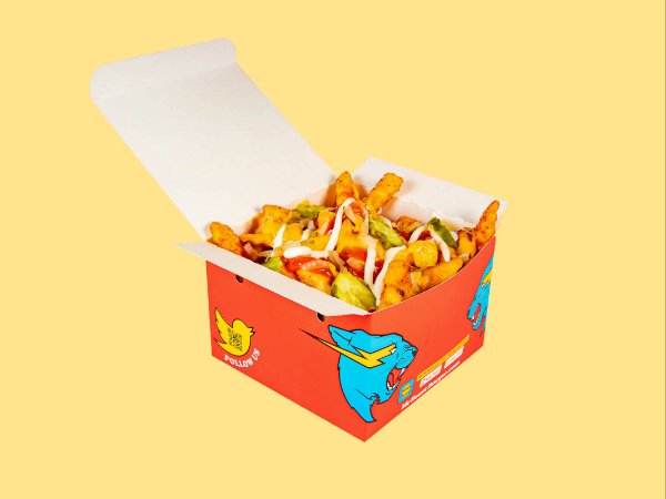 Papas fritas picantes cubiertas con queso americano, cebollas caramelizadas, pepinillos, mayonesa, ketchup y mostaza.