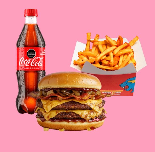Hamburguesa con dos carnes de bordes crujientes y sazón de la casa, queso americano, Salsa BBQ, cebolla asada y tocino sobre pan brioche tostado + papas + bebida a elección.