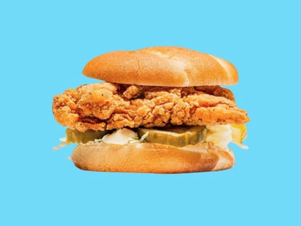 Sandwich con nashville hot chicken (levemente picante), mayonesa, ketchup, lechuga y pepinillos sobre pan brioche tostado.