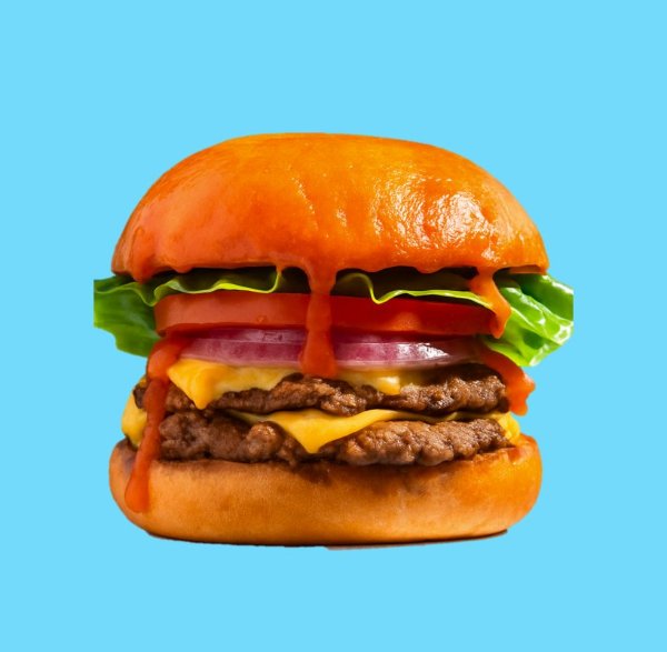Hamburguesa con dos carnes de res con bordes crujientes y sazón de la casa, queso americano, mayonesa, vegetales (tomate, lechuga y cebolla), ketchup y mostaza brown sobre pan brioche tostado.