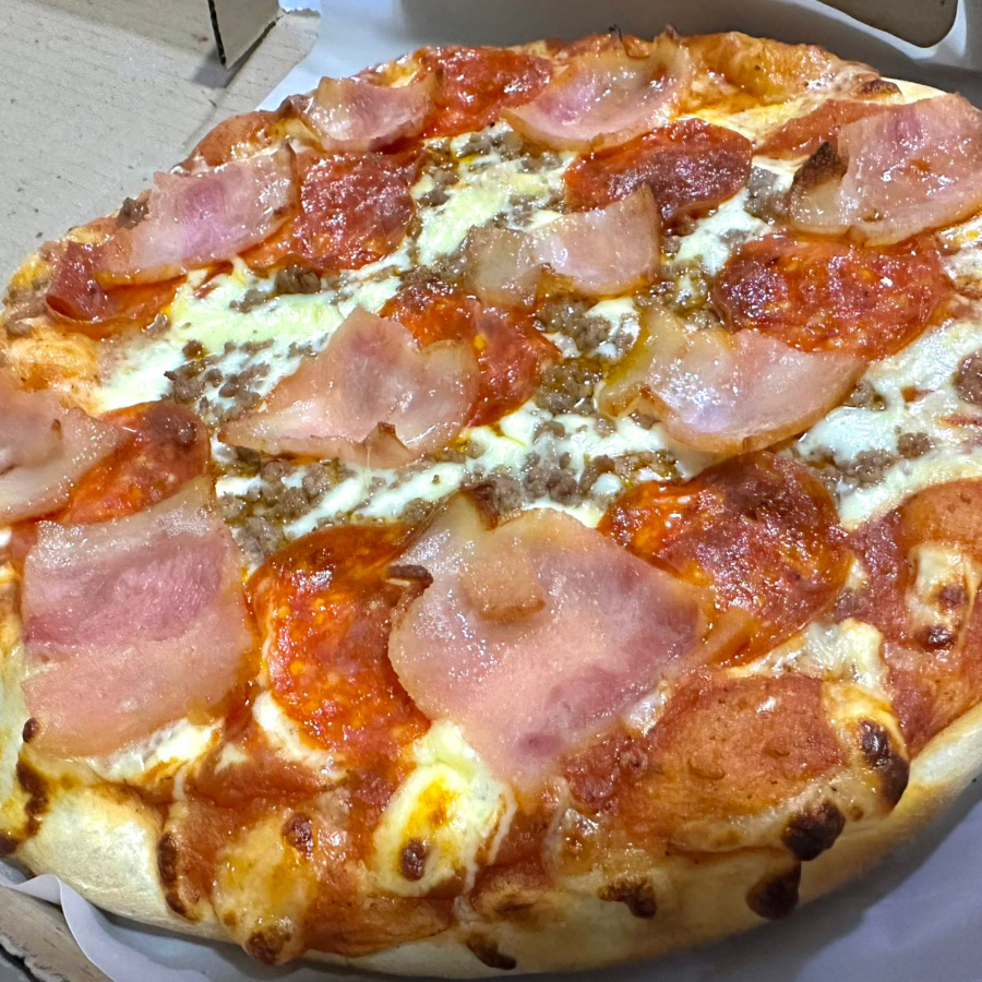 MASA ARTESANAL-SALSA NAPOLITANA-QUESO-CARNE-JAMON-PEPPERONI.TOCINETA-TRIPLE QUESO