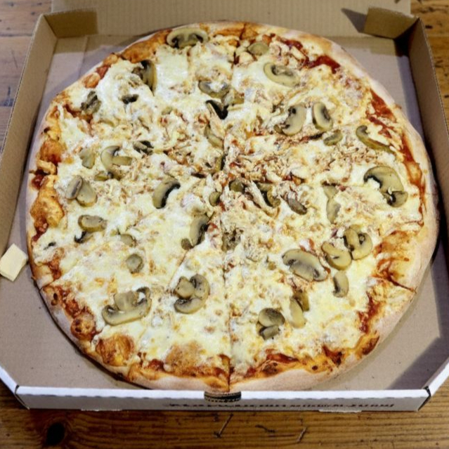 MASA ARTESANAL-SALSA NAPOLITANA-DOBLE QUESO-POLLO DESMECHADO-CHAMPIÑONES AL AJILLO