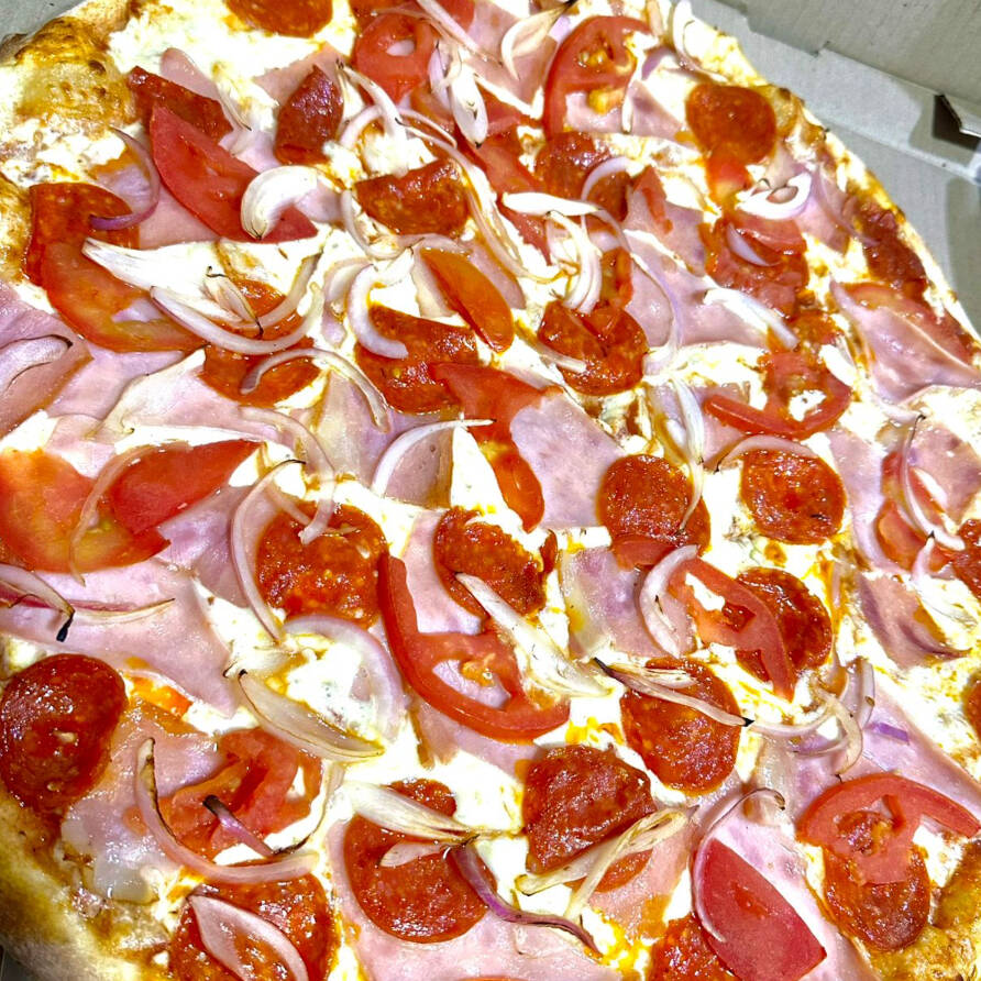 MASA ARTESANAL-SALSA NAPOLITANA-DOBLE QUESO-PEPPERONI-TOCINETA-JAMON-CEBOLLA-TOMATE