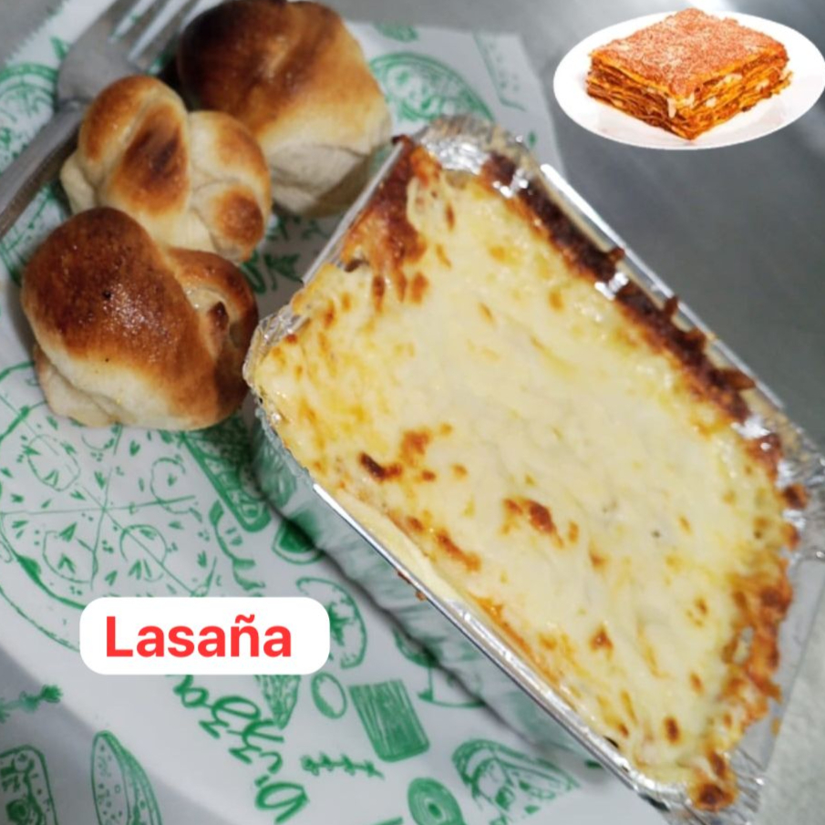 PASTA DE LASAÑA-SALSA NAPOLI-CARNE A LA BOÑESA-SALSA BECHAMEL-QUESO-Y QUESO PARMESANO CON PANCITOS AL AJILLO