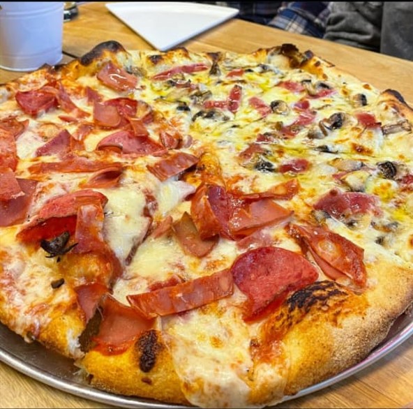 Pizza clásica mediana de 8 porciones con ingredientes a elección.