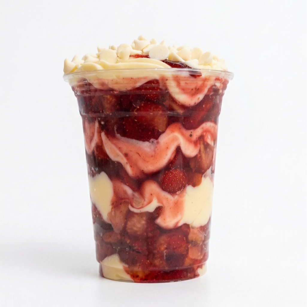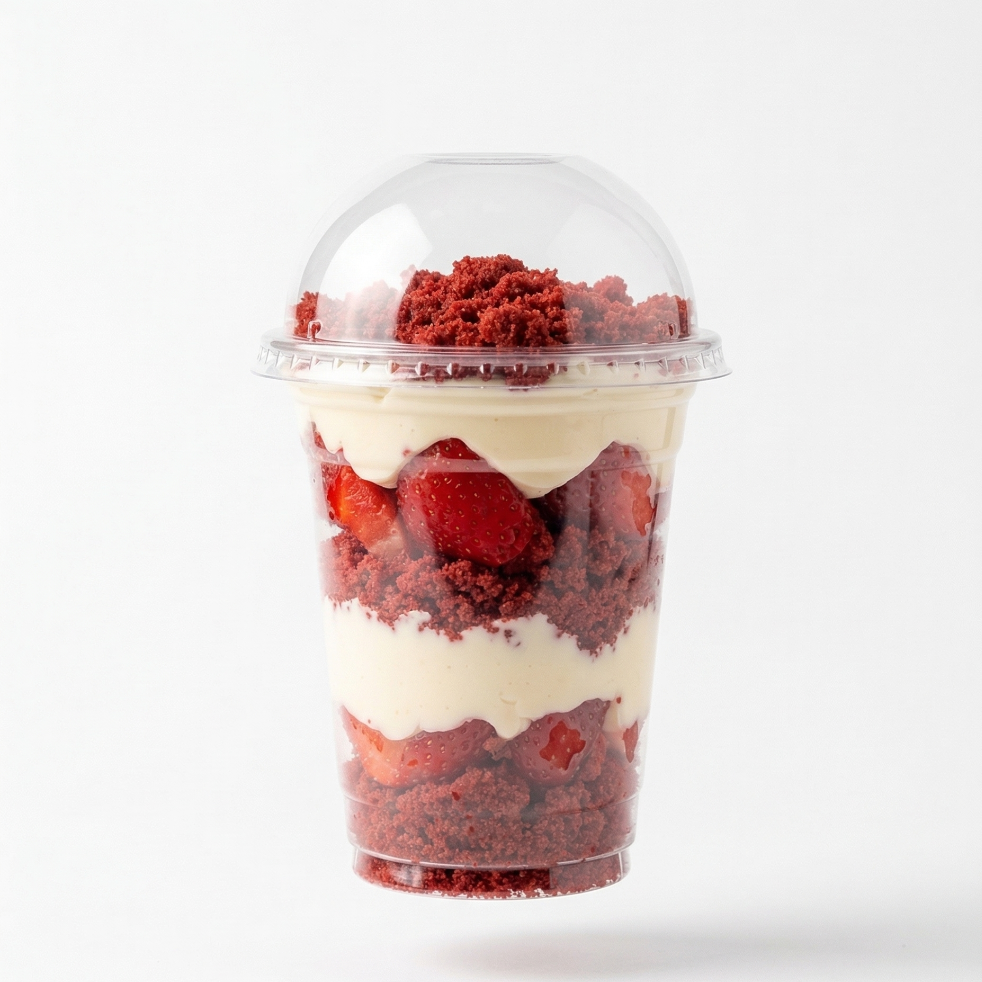 Mezcla de red velvet, queso, fresa y crema artesanal.