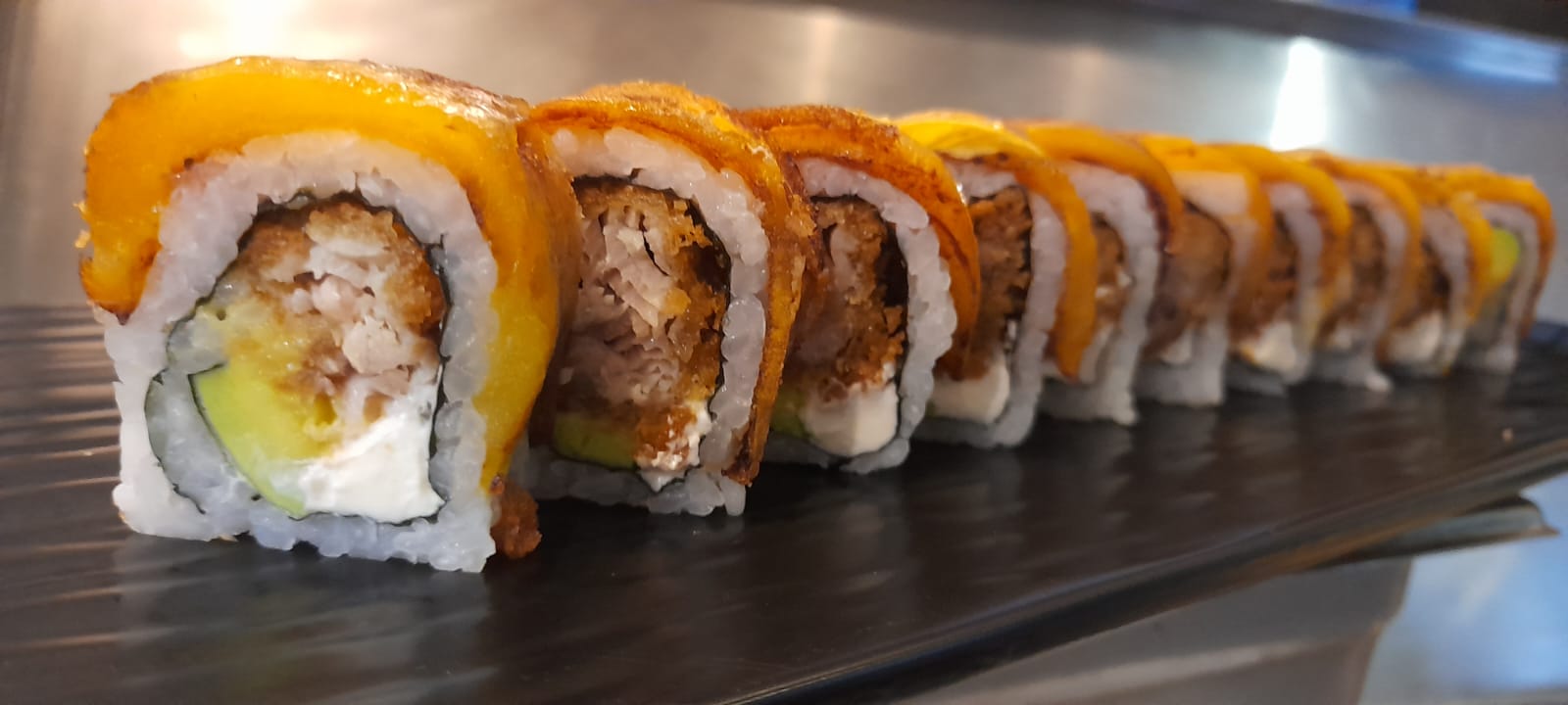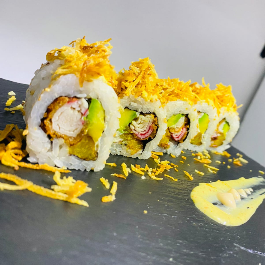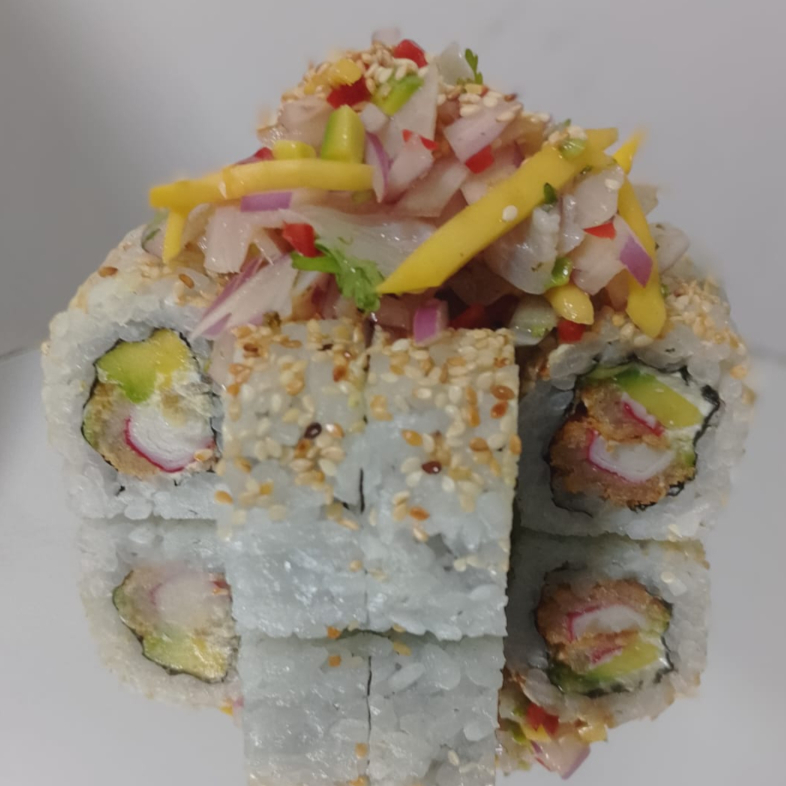 10 bocados relleno con langostinos tempura, queso crema, aguacate y cebollín topping de langostinos bañados en salsa de anguila y miel mostaza.