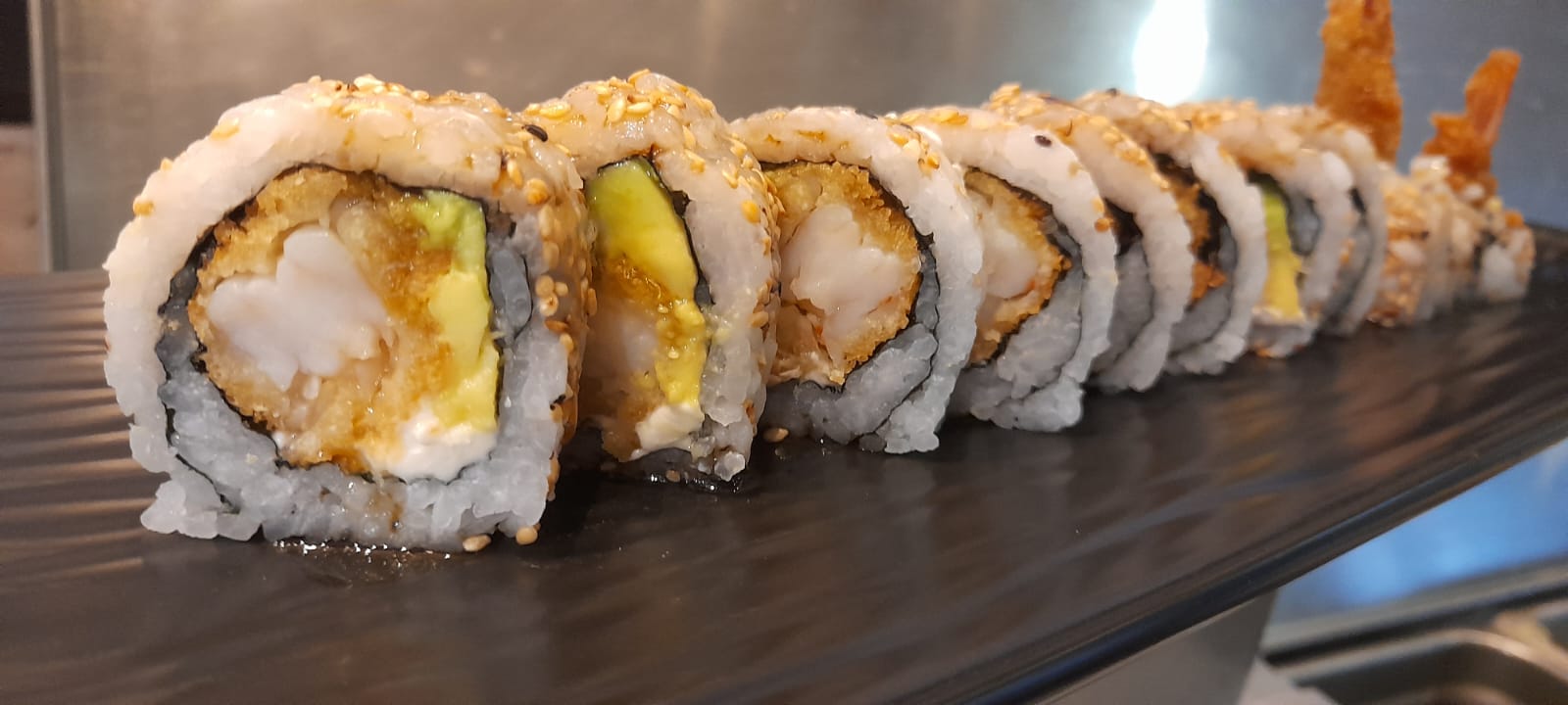 10 bocados ,langostinos tempura queso crema y aguacate cubierto de ajonjolí.