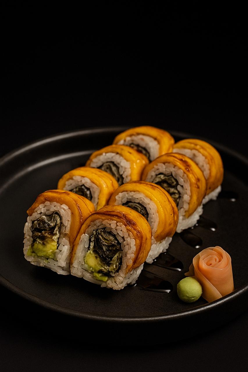 10 roll Rellenoa con aguacate y piel de salmón crocante y topping de plátano maduro acompañado con salsa de anguila