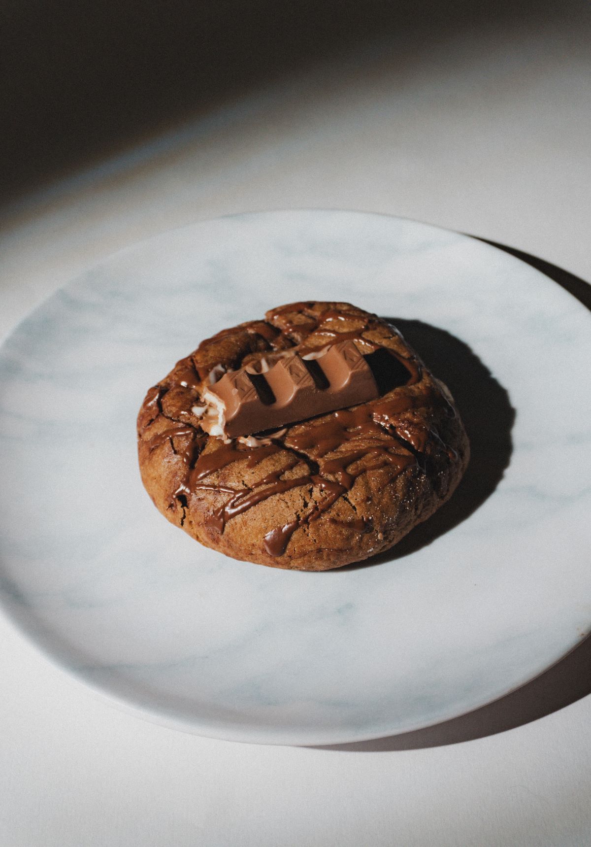 Galleta de chocolate, rellena de kinder bueno y cubierta de chocolate de leche y kinder bueno.