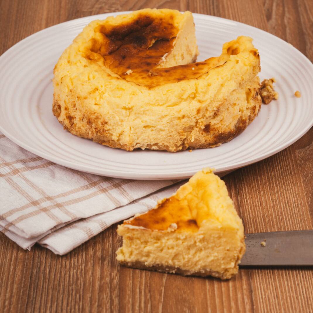 Porción de cheescake vasco, deliciosa y esponjosa. Acompáñala a tu gusto.