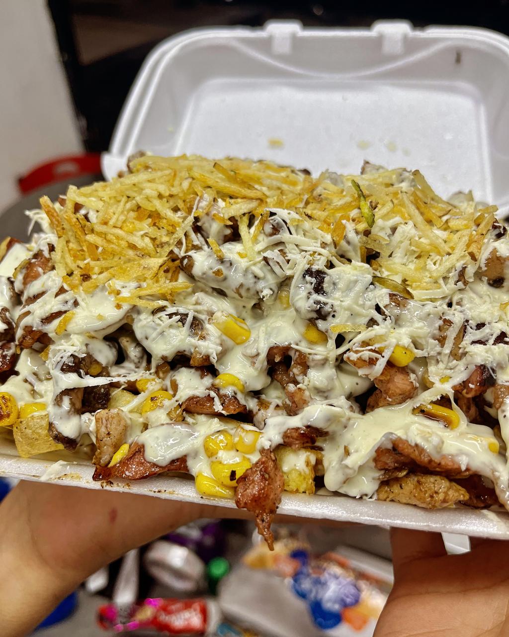 Papa natural a la francesa, pollo, carne de res, chorizo, tocineta, maíz, salsa de ajo de la casa, salsa rosada.