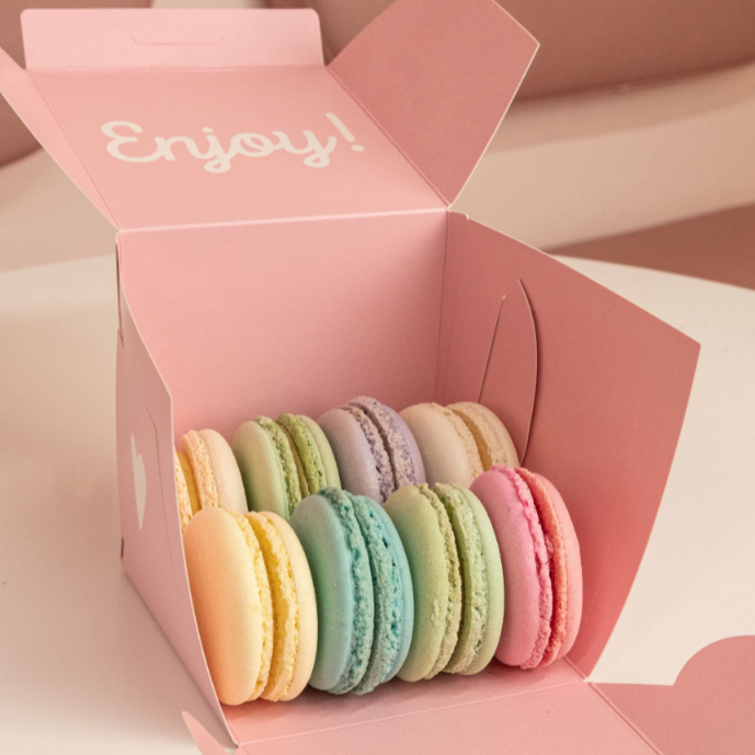Macarons franceses hechos con harina de almendras y con los rellenos más ricos, selecciona tus sabores favoritos.