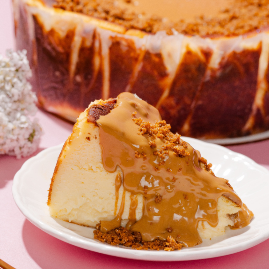 Tarta de queso caramelizada por fuera y cremosa por dentro con topping de crema lotus y galleta biscoff. 2-4 porciones