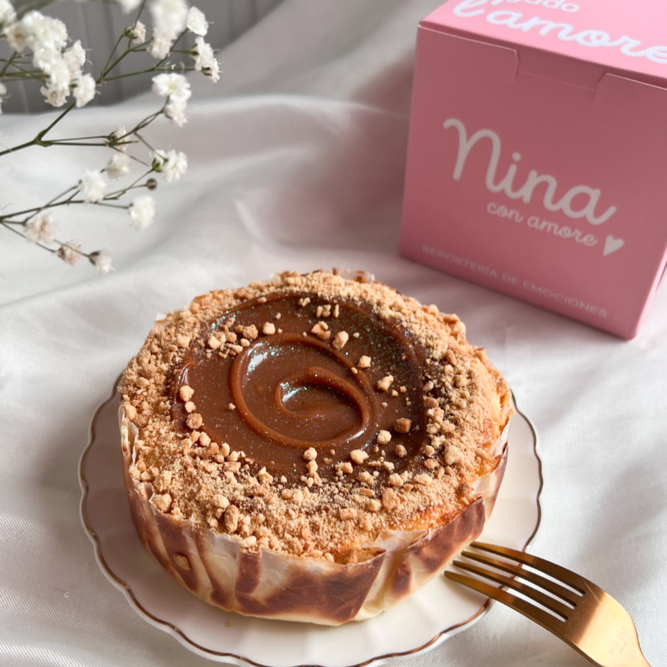 Tarta de queso caramelizada por fuera y cremosa por dentro con arequipe y galleta sultana, 2 a 4 porciones.