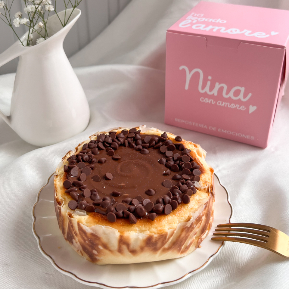 Tarta de queso caramelizada por fuera y cremosa por dentro con topping de nutella y chips de chocolate, 2 a 4 porciones.
