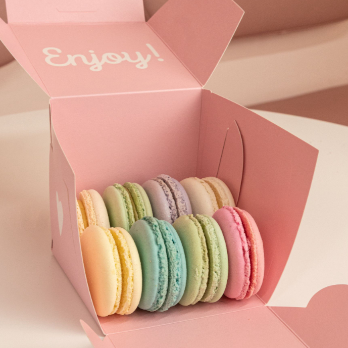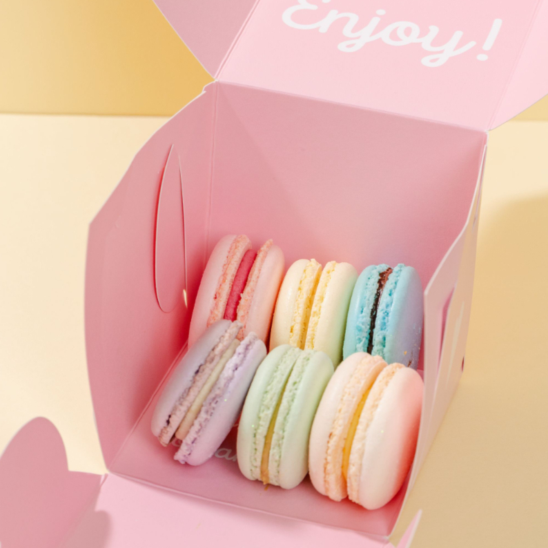 Selección de los mejores macarons de la ciudad. Elige tu cajita por 6 unidades surtidas o de tu sabor favorito.