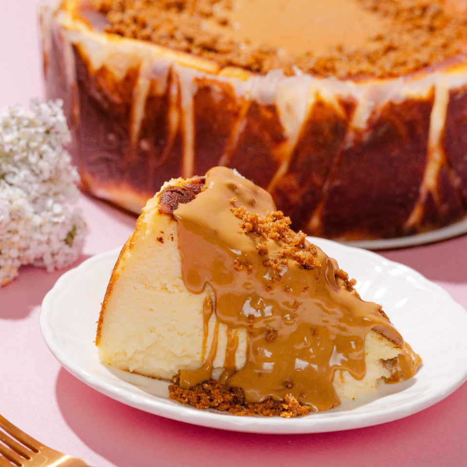 Cremosa tarta vasca de queso cubierta con crema y el inconfundible crujiente del crumble de galleta Lotus.