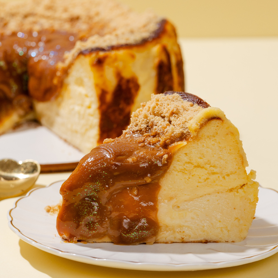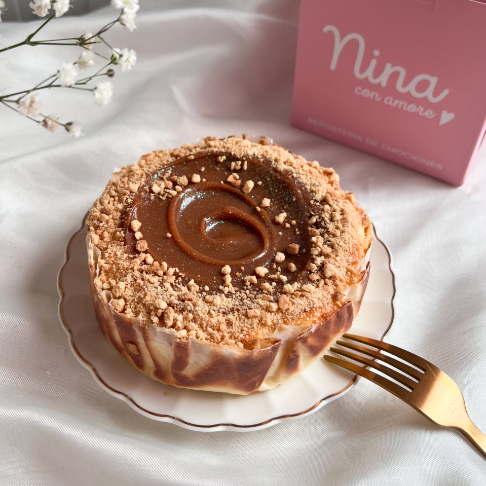 Tarta de queso caramelizada por fuera y cremosa por dentro con arequipe y crumble de galleta Sultana, 2 a 4 porciones.