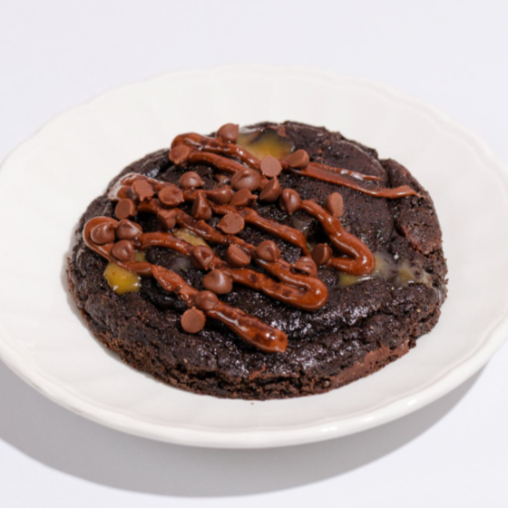 Galleta estilo New York (gordita y rellena) de masa de chocolate, con centro de caramelo salado artesanal y Nutella.