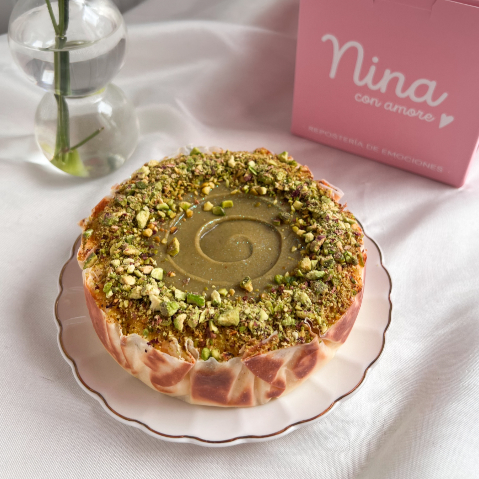 Tarta de queso caramelizada por fuera y cremosa por dentro con topping de pistacho. 2 a 4 porciones