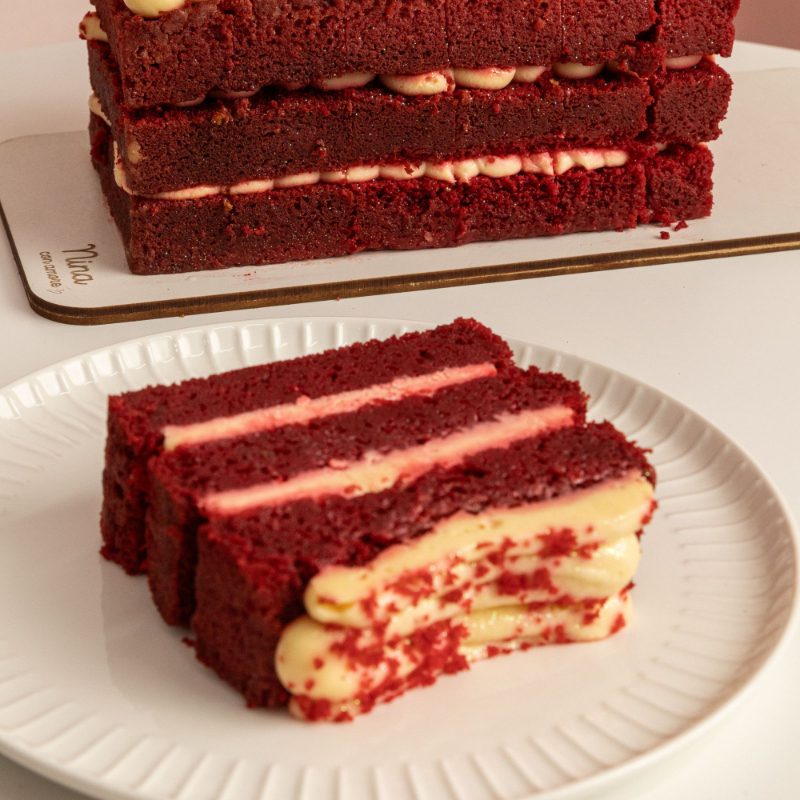 Clásico bizcocho red velvet con un suave y equilibrado relleno de frosting de queso crema.