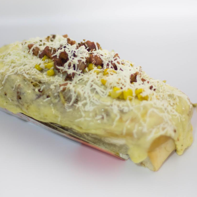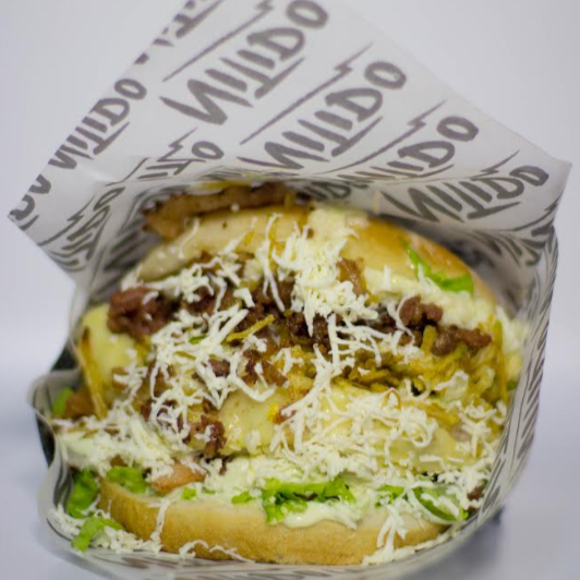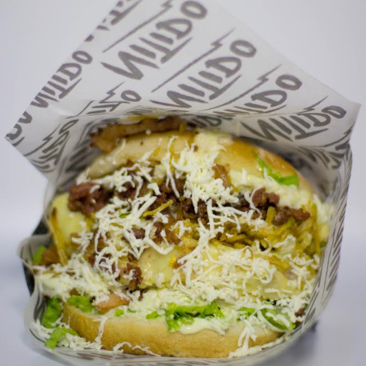 Pan artesanal con deliciosa mezcla de pollo, cerdo y res sobre una base de lechuga con tomate y ensalada de repollo, tocineta, queso rallado, queso mozzarella y nuestra deliciosa salsa de ajo de la casa.