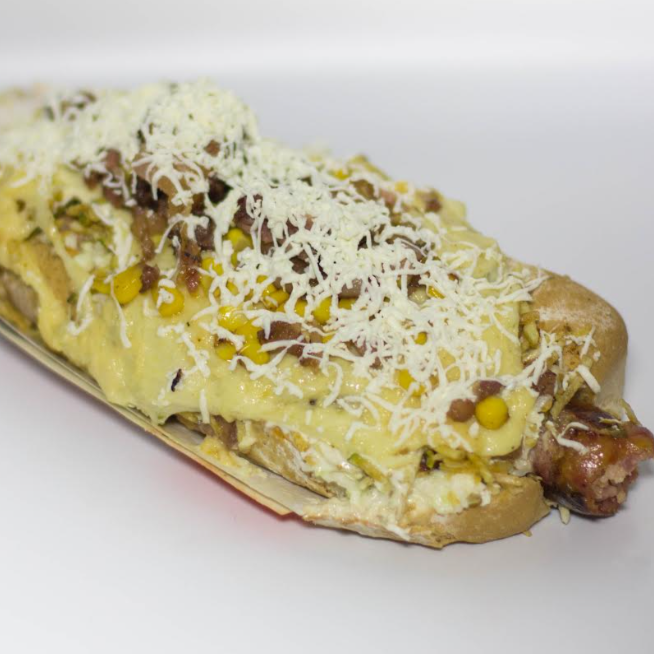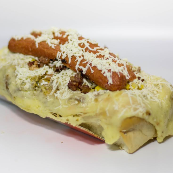 Panecillo artesanal, chorizo tradicional, ensalada de repollo, tocineta, ripio de papa, queso mozzarella y queso rallado con maicitos y nuestra deliciosa salsa de ajo de la casa.