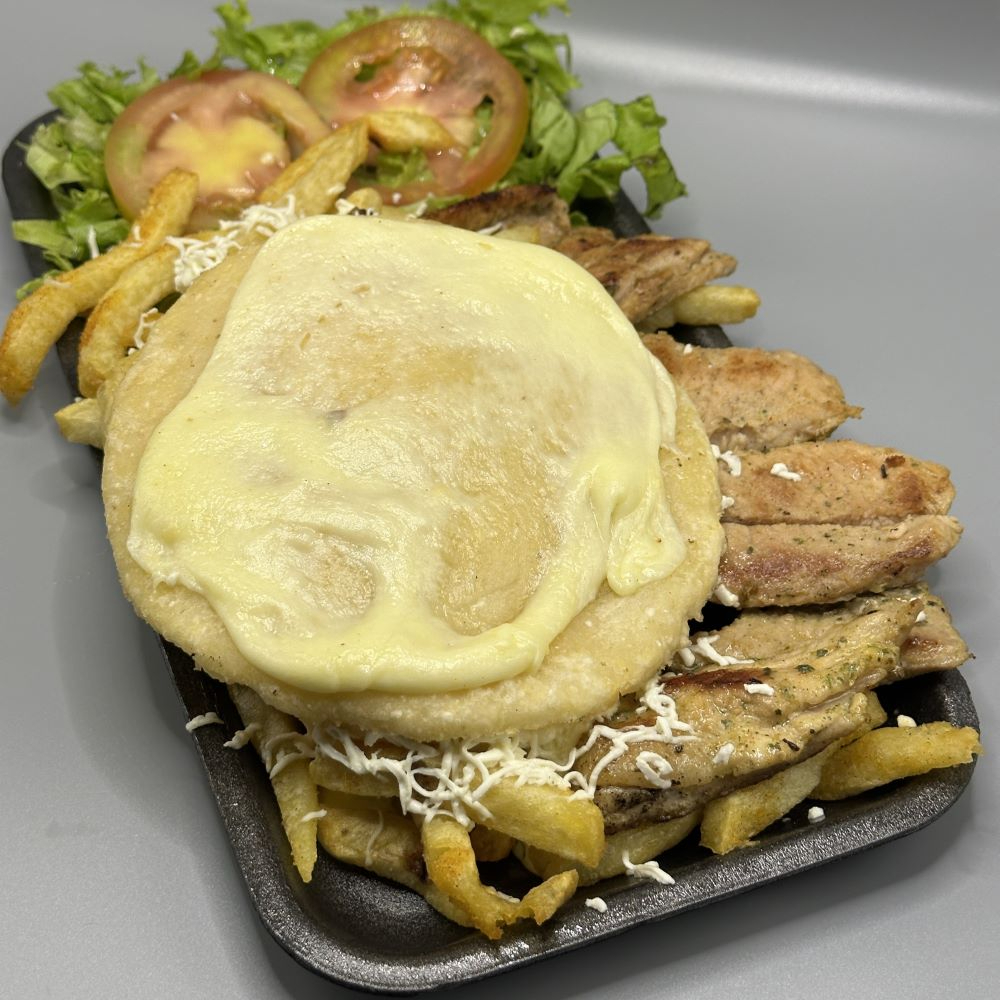 250gr de pollo y cerdo, ensalada de lechuga crespa con tomate y vinagreta casera, con papas a la francesa y acompañado de arepita con queso y queso rallado.