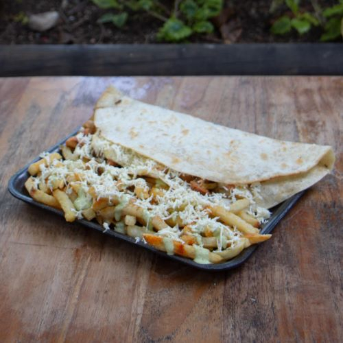 Pollo desmechado, lechuga crespa, tomate, tocineta, maíz, chorizo, queso rallado, salsa de ajo de la casa y papas a la francesa.